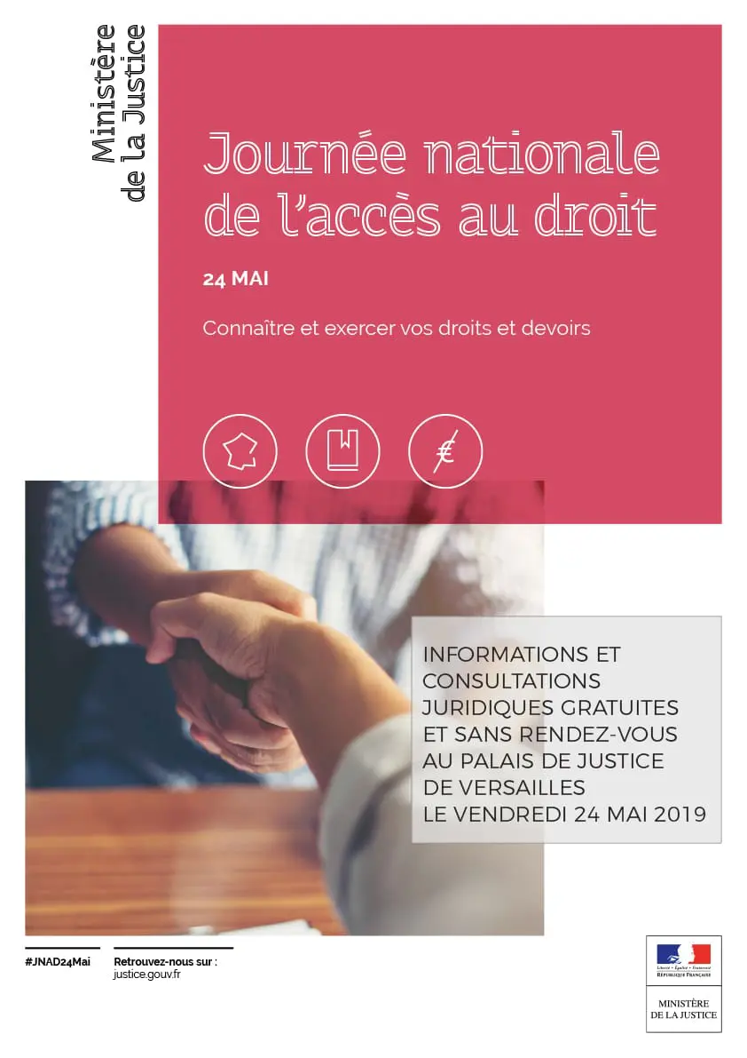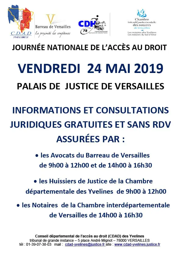 Le conseil départemental de l’accès au droit des Yvelines (CDAD des Yvelines) organise le vendredi 24 mai une « journée d’informations et de consultations juridiques gratuites » au sein du palais de Justice de Versailles en collaboration avec le tribunal de grande instance de Versailles, l’ordre des avocats du barreau de Versailles, la chambre départementale des huissiers de justice des Yvelines et la chambre interdépartementale des notaires de Versailles.